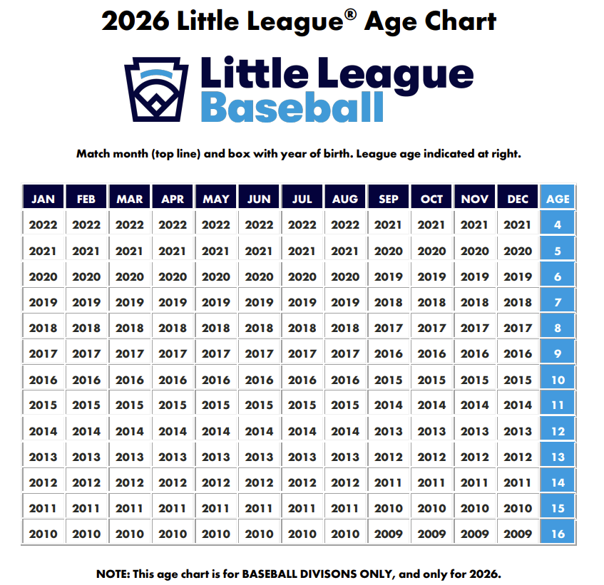 The Age Determination Date for a Little League Baseball player is the actual age of a child as of August 31 of the current year. This date identifies the “league age” as it relates to a player’s eligibility to participate in any of Little League’s divisions of play. You can use the chart below to determine the "league age" of your player/child. You can also use the Little League Age Calculator.